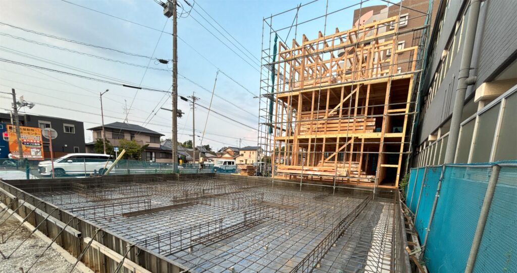 2025-09-20 / 最終更新日時 : 2025-09-20 事業部住宅 ブログ 須ヶ口アパート2 工事のシムラです。 須ヶ口アパート2棟目も配筋も終わり、ベースコンクリートを打設しました。 この後、基礎の立上り型枠を組み、立上りコンクリートを打設します。 隣の先行した物件は、建方も終わり、これから造作工事に入っていきます。 DCP PHOTO