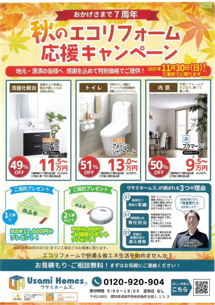 そこで有言実行のウサミホームズ。では「秋のエコリフォームキャンペーン」を開催しています。