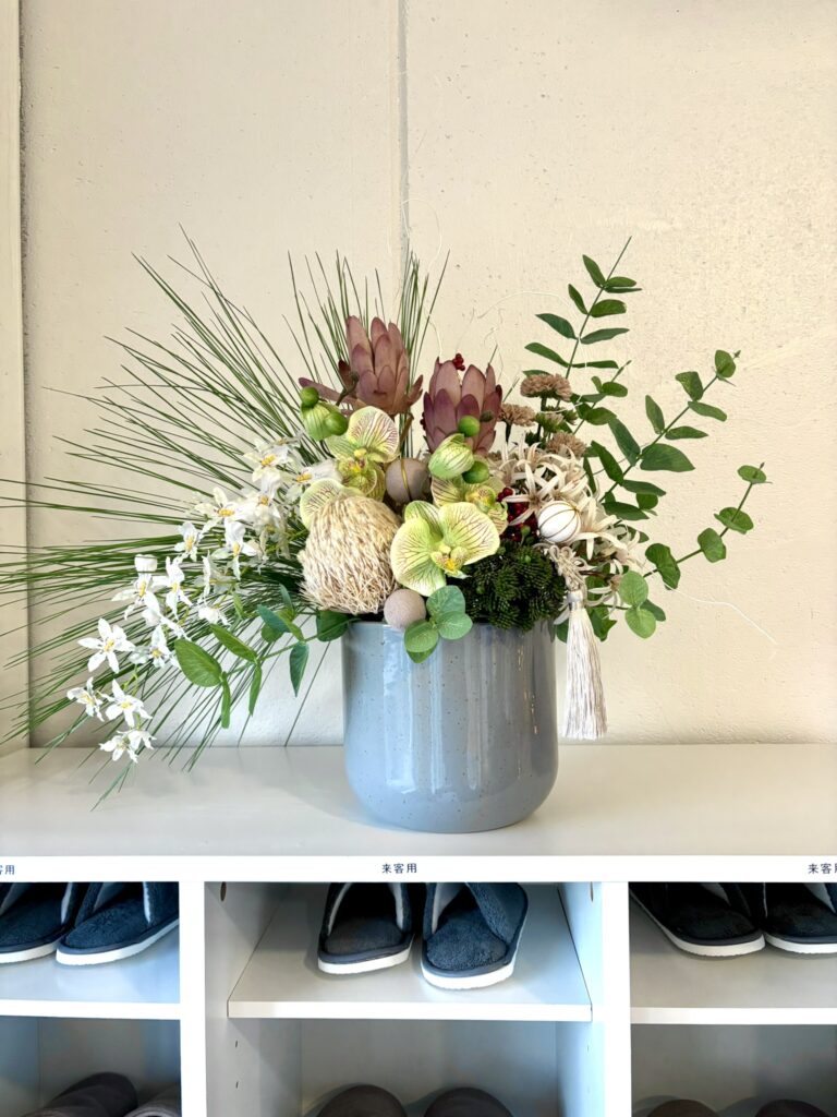 お正月のお祝いにふさわしい松や蘭を取り入れたアレンジで、