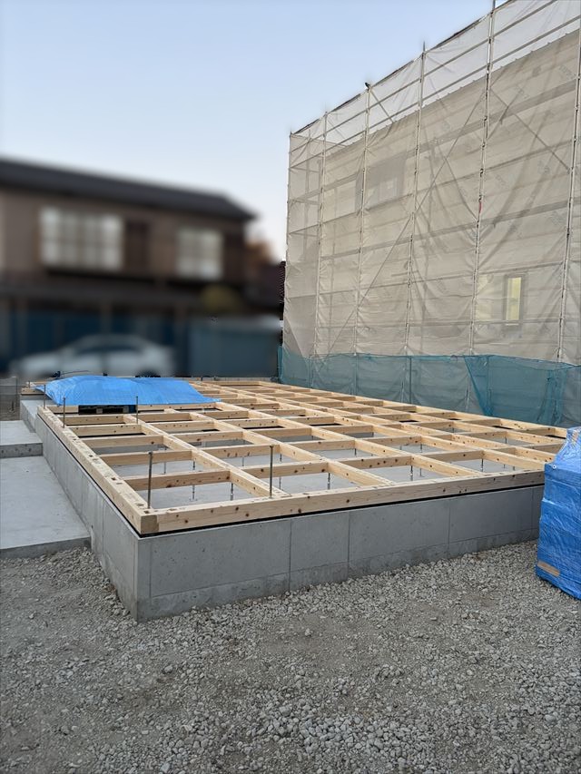 その後、床下の断熱材を施工し、床を貼ったら、しっかりとブルーシートで
