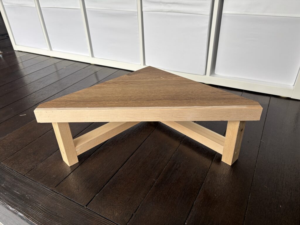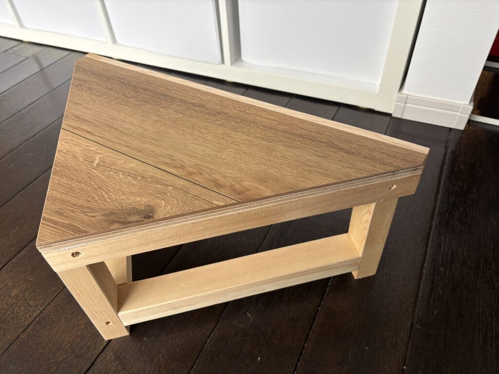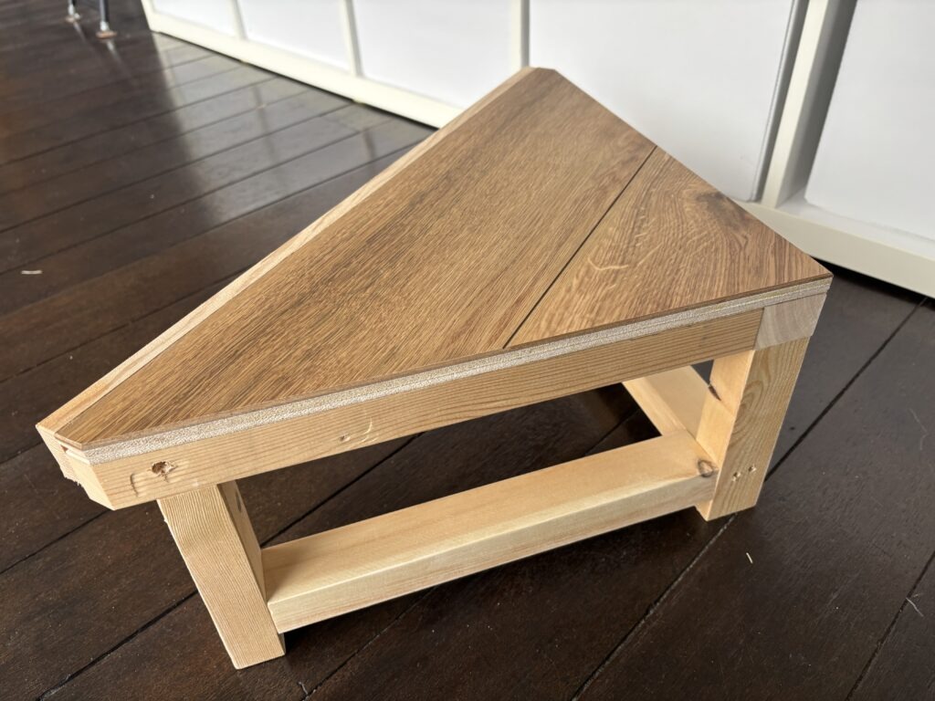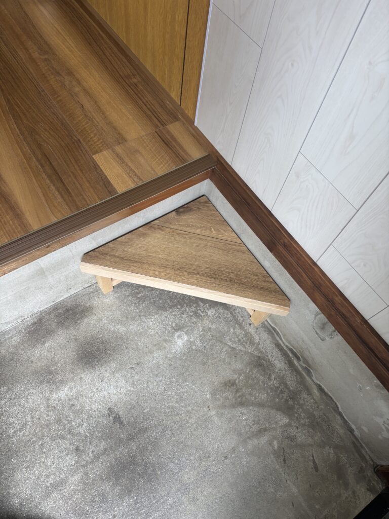 「玄関で床に上がる段差が高くで毎日大変、踏台を置きたいが玄関があまり広く無く、市販の踏台は四角形しかないので困っている。三角形の踏台は無いだろうか?」とご相談を受けました。