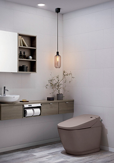 後ろに水をためるタンクがない、スッキリとした見た目が特徴のトイレ。水道直結式で場所を取らず、デザイン性やお掃除のしやすさも人気です。