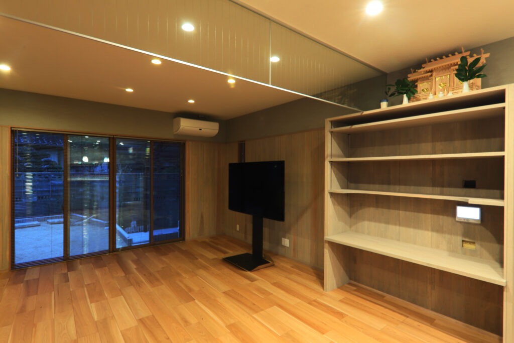 リビングは約20畳の広々設計。全体の雰囲気を壊さないように備え付けの棚を設置し、神棚として使用します。リビングは家族が集まる場所なので、家族全員で自然に神棚に手を合わせる機会が増え、毎日のお参りが習慣化して家族の絆や安心感が深まることでしょう。キッチンも人気のカウンターキッチンを採用して調理しながらもリビングに目が行き、家族との会話が楽しめます。
