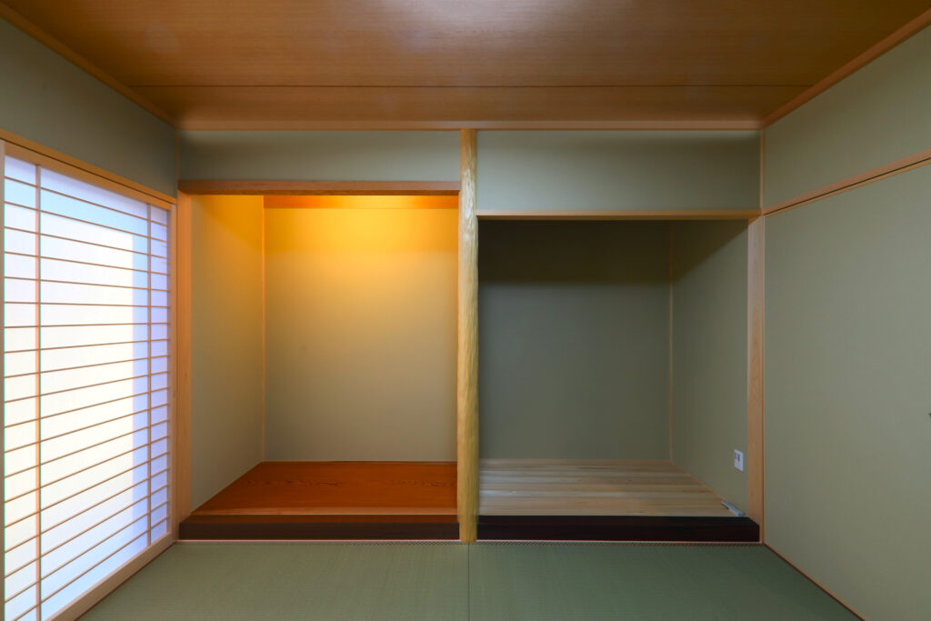 一番のこだわりの和室は、床の間廻りは、真壁風な造りにして、床柱や床板、仏間の床は無垢板で造作してあります。