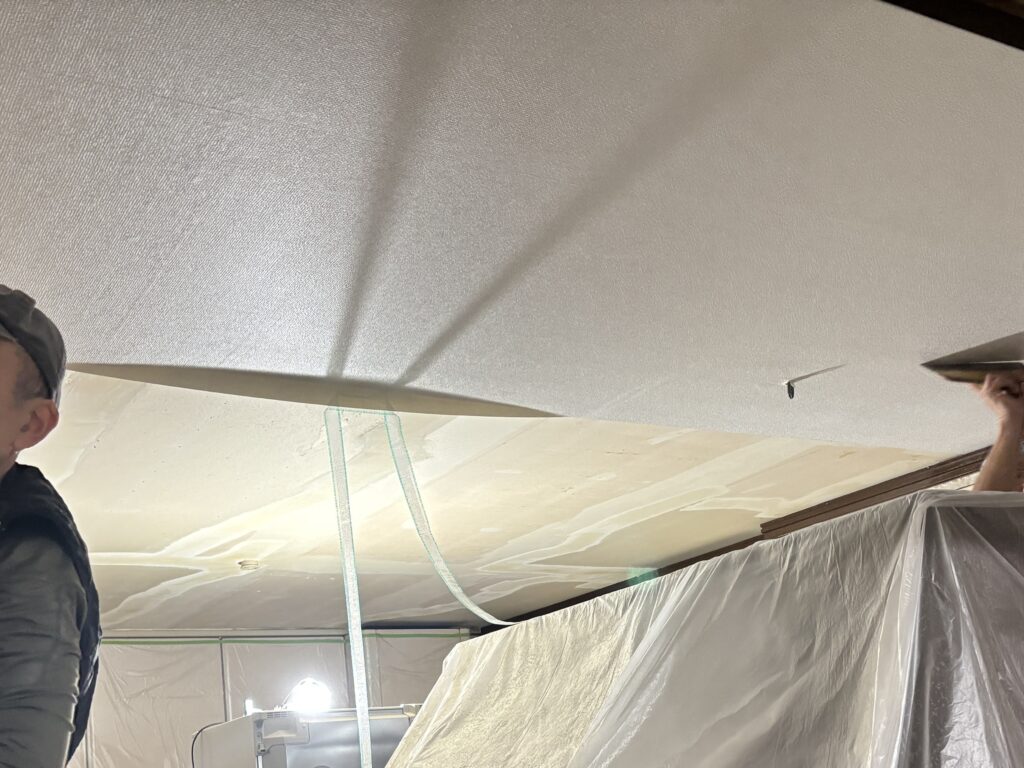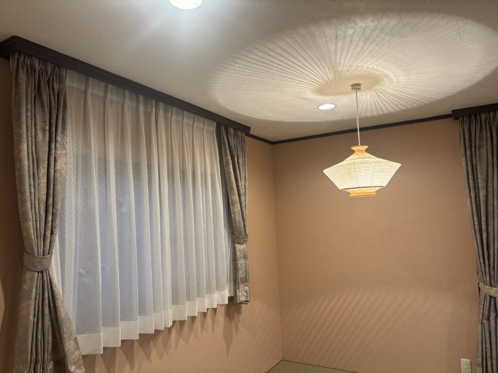 お客様のご要望は古くなった壁紙の貼り換えとコンセント・スイッチ・照明器具の交換新たに本棚の設置でした。お客様から「春先の花粉症が辛くて、何か快適になる内装材を知りたい」とのご要望があり壁と天井に「漆喰」の施工をご提案しました。「漆喰」は抗菌性・調湿性・消臭性に優れた建築材料で耐火性もあり火にも強いです。自然素材である為、化学物質を含まない非常に安全な建築材料になります。