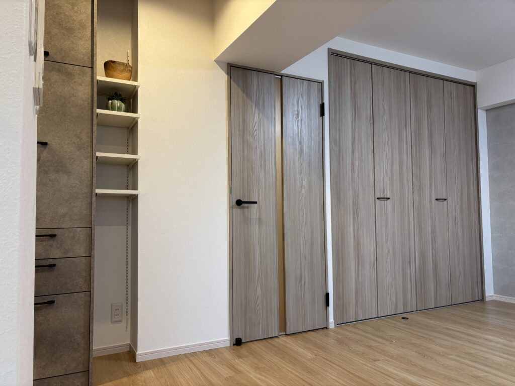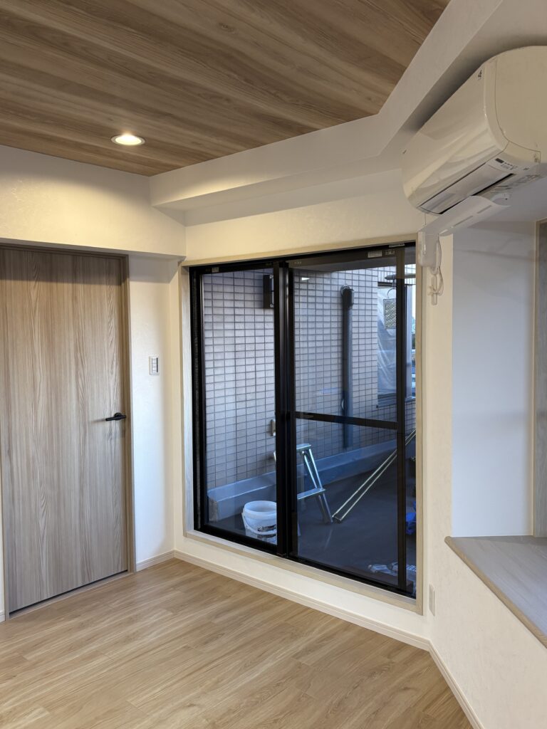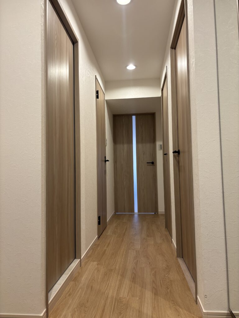 既存のフローリング・内装ドア・住宅設備を全て解体処分をしました。フローリングは新しい防音フローリングを施工して、キッチンはクリナップ製ユニットバス・洗面化粧台・トイレは、LIXIL製を採用しました。内装ドアはDAIKENの新しくなったイエリアシリーズを採用して、ナチュラルでモダンなイメージを演出しました。天井の照明器具はダウンライトをメインとしてスッキリとさせました。先進的マドリノベ事業の補助金を活用して、窓に内窓を取り付けた為お部屋の断熱性能が大幅に向上してお客様が大変喜ばれました。